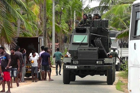| Des soldats en patrouille à Kalmunai, au lendemain des attentats-suicide à la bombe le dimanche de Pâques, au Sri Lanka. |