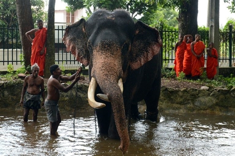 | Un éléphant prend son bain près d'un temple à Colombo sous les yeux de moines bouddhistes, le 17 juin 2016. |