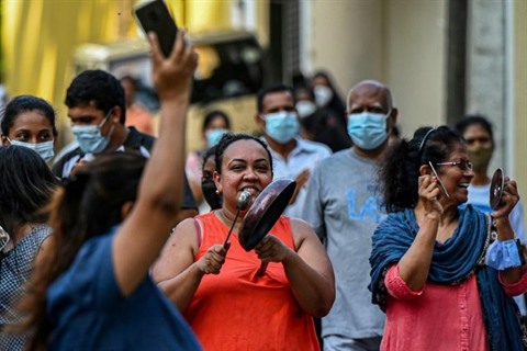 | Des manifestants tapent sur des ustensiles lors d'une manifestation à Colombo le 3 avril. |
