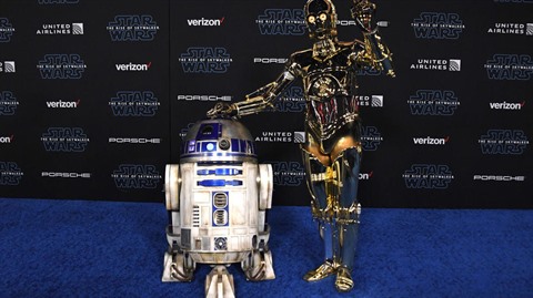 | Les droïdes R2-D2 (gauche) et C-3PO à la première du dernier opus de Star Wars, en Californie. |
