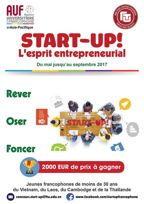 Les participants doivent être des jeunes vietnamiens, cambodgiens, lao et thaïlandais. Les inscriptions s'effectuent, soit individuellement, soit par équipe de maximum de trois personnes, dont un des membres est désigné «chef d'équipe». Un candidat ne peut présenter qu’un seul projet. Le formulaire d’inscription est à télécharger sur la fanpage du concours www.facebook.com/startupfrancophone. Il doit être envoyé à l’adresse concours.start-up@ftu.edu.vn et par voie postale au Bureau de management des projets de l’ESCE, 9e étage, bâtiment A de l’ESCE, 91, rue Chùa Láng à Hanoï, avant le 25 juin dernier délai.