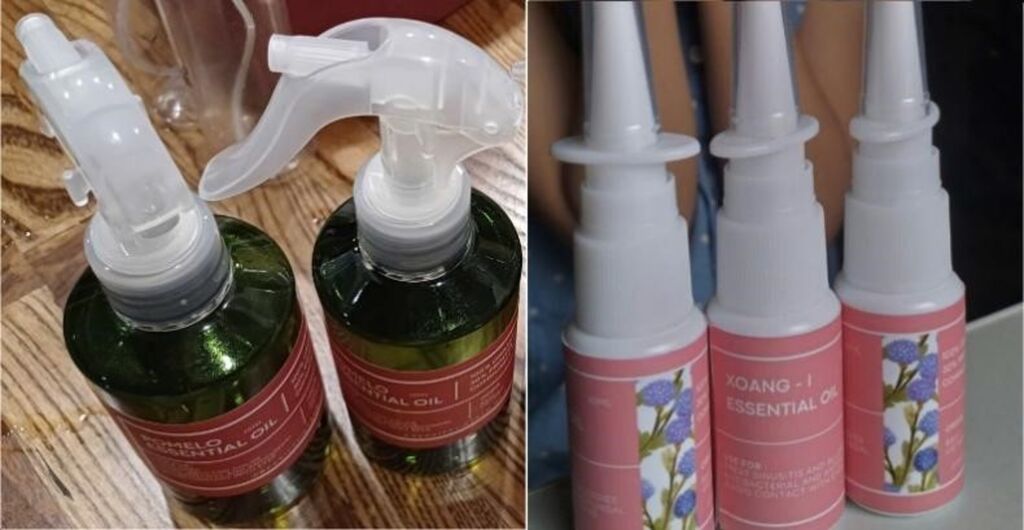 | Huile essentielle de citronnelle (gauche) et spray nasal à l’essence de fleur de Bidens pilosa (droite). |