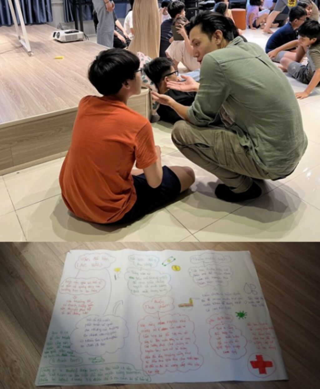 | Phạm Hoài Nam au Camp d’été sur l’Intelligence émotionnelle et un des plans des enfants participant à ce camp, en juillet 2024. Photo : Greenify |