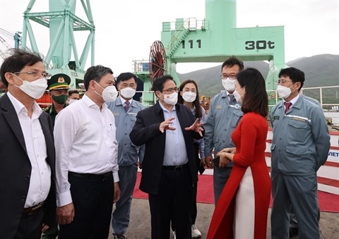 | Le Premier ministre Pham Minh Chinh (centre) visitant le chantier naval de Hyundai Vietnam dans la ZE de Vân Phong, le 12 mars. |