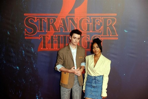 | Les acteurs américains Noah Schnapp et Priah Ferguson avant une projection en avant-première d'épisodes de la saison 4 de Stranger Things, le 24 mai à Paris. |