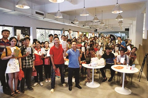 | L’auteur Dung Phan (T-shirt bleu) lors de la présentation de son livre, le 25 mai à Hanoï. |