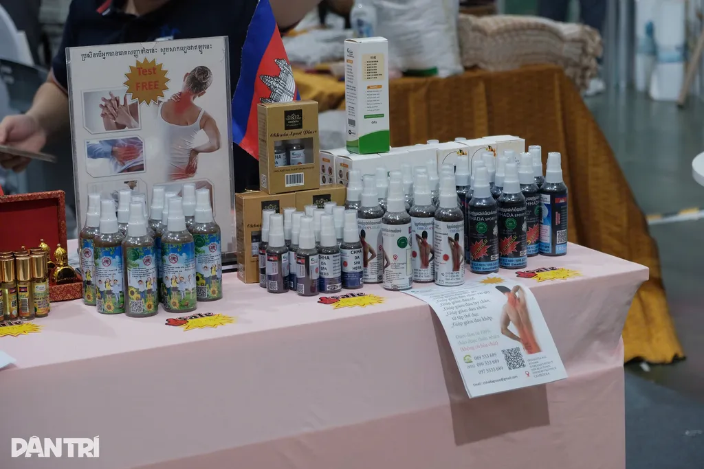 | Stand du Cambodge présentant des huiles de massage et des produits de bien-être formulés à partir d'extraits végétaux. |
