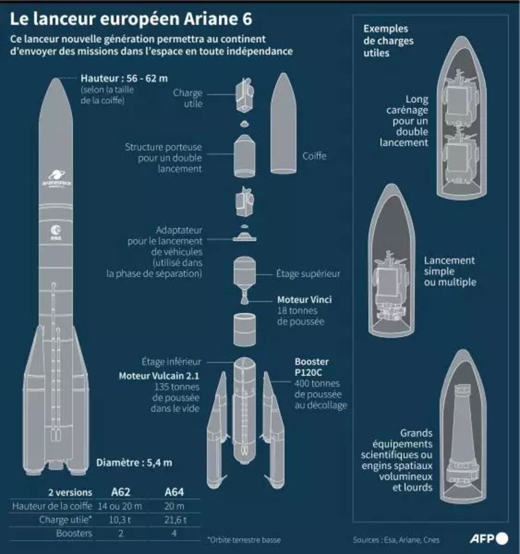 Décidée en 2014, Ariane 6 pourra aussi bien placer des satellites en orbite géostationnaire, à 36.000 kilomètres d'altitude, comme Ariane 5, que mettre en orbite des constellations à quelques centaines de kilomètres de la Terre.