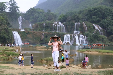 | Des touristes visitent la chute d'eau de Ban Giôc à Cao Bang. |