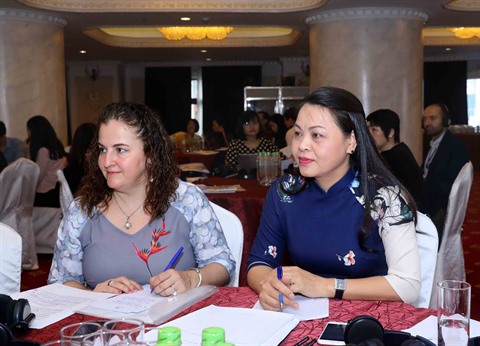 | Nguyên Thi Thu Hà, présidente de l'Union des femmes du Vietnam (droite) et Elisa Fernandez, responsable du bureau de l’ONU Femmes au Vietnam lors du séminaire le 27 avril à Hanoï. |