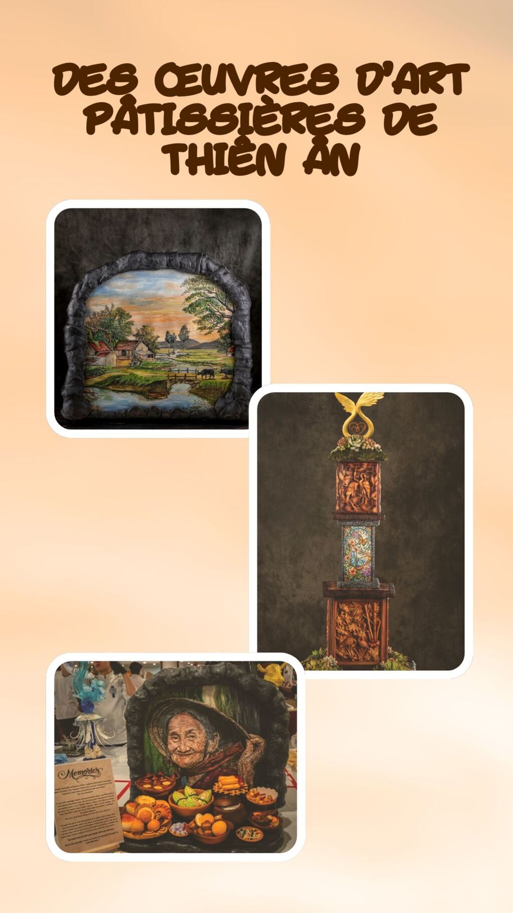 Alors que nombre de ses confrères choisissent des thèmes modernes ou occidentaux, Thiên Ân revendique une esthétique vietnamienne. Il ne se contente pas d’orner ses gâteaux de motifs traditionnels ; il les recrée, les réinvente, les sublime. Il fait parler l’Histoire et le quotidien à travers des couches de douceur.