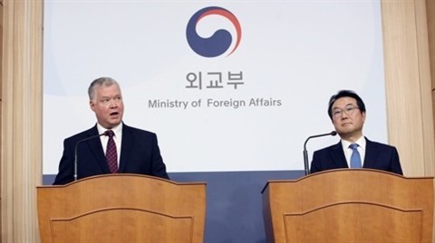 | Stephen Biegun (gauche) et Lee Do-hoon, le 16 décembre 2019 à Séoul. |