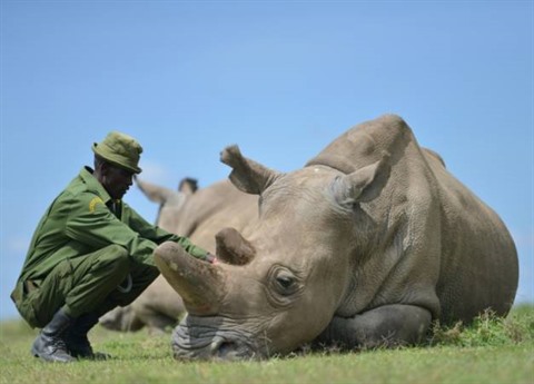 | Najin, une des deux dernières femelles rhinocéros blancs du Nord, le 5 décembre 2016 avec un de ses gardiens de la Réserve d'Ol Pejeta. |