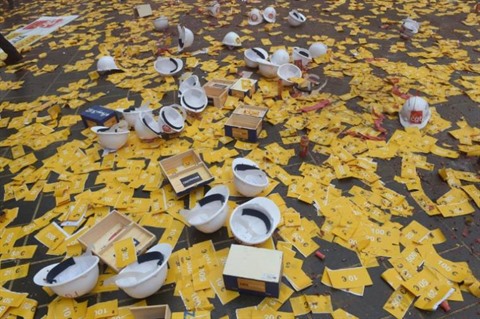 | Des casques de chantier disposés au sol par des manifestants contre l'offre de Veolia sur Suez, le 29 septembre 2020 dans le quartier de La Défense à Paris. |