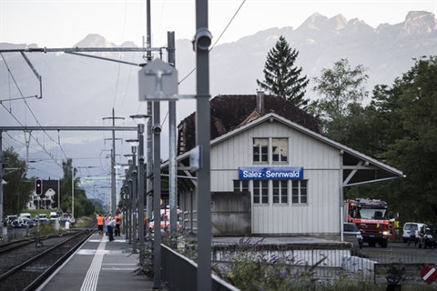 | Des services de secours à la gare de Salez (commune de Sennwald, Suisse), après l’attaque dans un train qui a fait six blessés. |