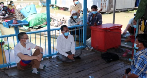 | L’ambassadeur du Vietnam au Cambodge, Vu Quang Minh (1er à gauche), a rendu visite à des personnes d’origine vietnamienne dans la zone concernée. |