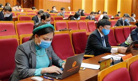 | Les participants lors d'une réunion à Quang Ninh (Nord) portent un masque de protection et respectent une distance pour la lutte contre le COVID-19. |