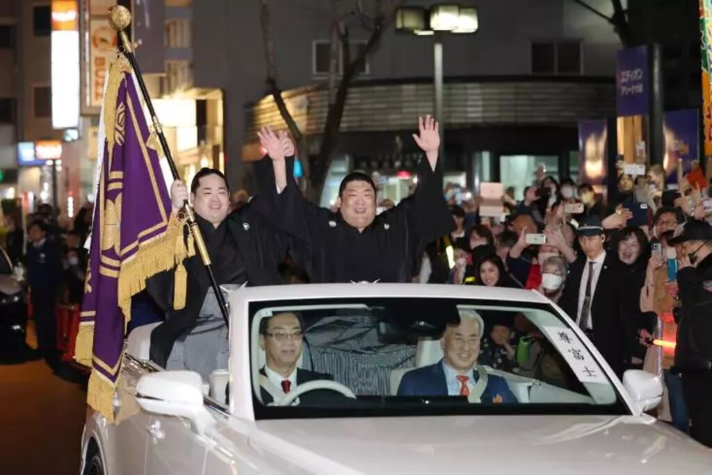 | Takerufuji célèbre sa victoire avec une parade dans les rues d'Osaka, au Japon, le 24 mars. |