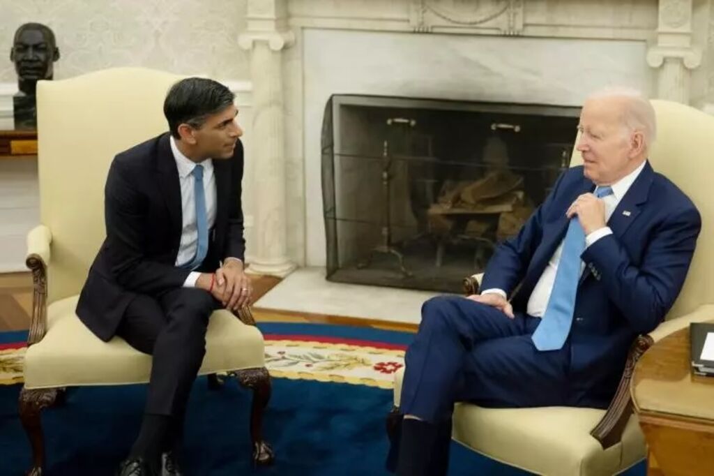 | Le président américain Joe Biden (droite) et le Premier ministre britannique Rishi Sunak à la Maison Blanche, le 8 juin. |