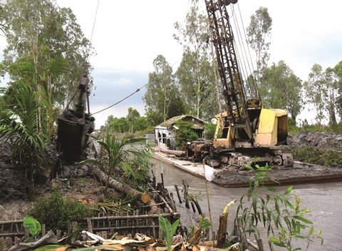 | Dragage d’un canal pour contenir l’eau douce dans le district de Long My, province de Hâu Giang. |