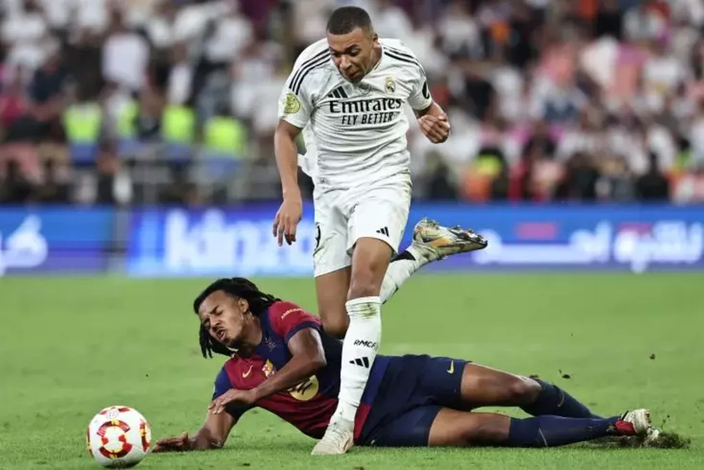 | Le défenseur du FC Barcelone, Jules Koundé, à terre face à l'attaquant du Real Madrid Kylian Mbappe en Supercoupe d'Espagne, le 12 janvier à Jeddah. |