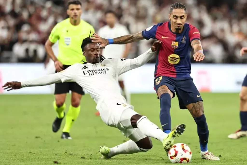 | Le milieu défensif du Real Madrid mis en difficulté par l'attaquant du FC Barcelone Raphinha en Supercoupe d'Espagne, le 12 janvier à Jeddah. |