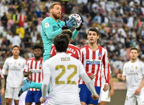 | Le gardien slovène de l'Atlético, Jan Oblak, s'empare du ballon contre le Real en finale de la Supercoupe d'Espagne, le 12 janvier à Jeddah. |
