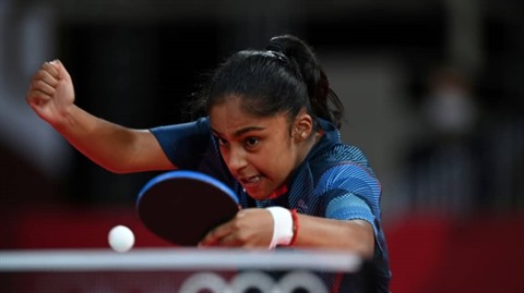 | La jeune Française Prithika Pavade au service lors du tournoi olympique de ping pong à Tokyo, le 2 août. |