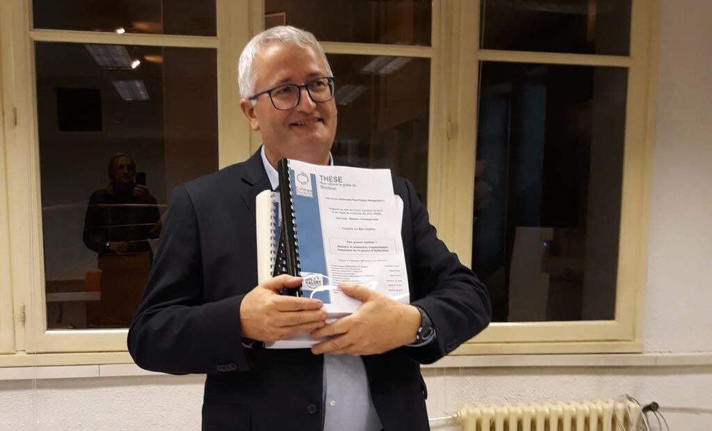 | Le professeur Eric Coudray tenant les cinq volumes de sa thèse de 2.000 pages. |