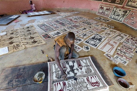 Les artistes peignent à même le sol sur les toiles, dans des cases ouvertes. Leur dextérité fascine. Leurs gestes sont précis. Avec des couteaux en fer ou des baguettes de bois qu'ils trempent dans des bols de liquide, le coton blanc devient rapidement une oeuvre d'art, figurant des animaux ou des personnages portant des masques.