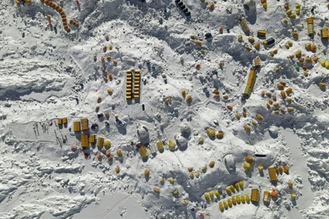 | Vue aérienne de tentes au camp de base de l'Everest, le 22 avril au Népal. |