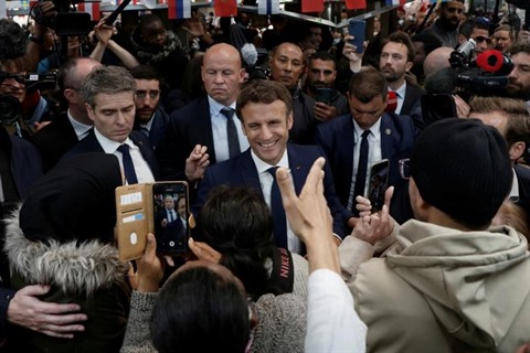 | Le président Emmanuel Macron en déplacement au marché Saint-Christophe de Cergy (Val d'Oise) le 27 avril |