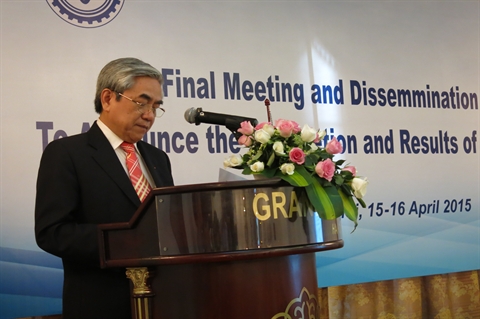 | Le ministre des Sciences et des Technologies, Nguyên Quân, s’exprime devant la presse à l’occasion de la conférence bilan du projet de partenariat UE - VARANS, le 16 avril à Hanoi. |
