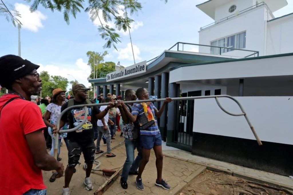 | Des manifestants attaquent le bâtiment de l'Assemblée nationale, le 17 février à Paramaribo, au Suriname. |