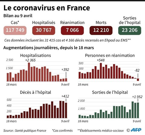 Mais l'Élysée a insisté sur le fait que cette rencontre ne représentait pas "une reconnaissance" de la méthode du professeur. Le bilan humain ne cesse de s'alourdir, avec au moins 12.210 morts depuis début mars, dont 8.044 à l'hôpital, soit 412 de plus de 24 heures, et le reste notamment dans les maisons de retraite médicalisées (Ehpad).