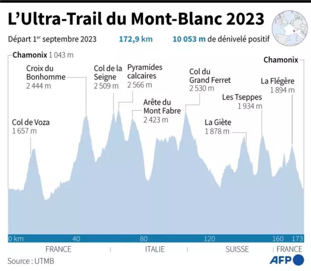 | Profil d'altitude de l'édition 2023 de l'Ultra-Trail du Mont-Blanc, dont le départ est donné le 1er septembre. |