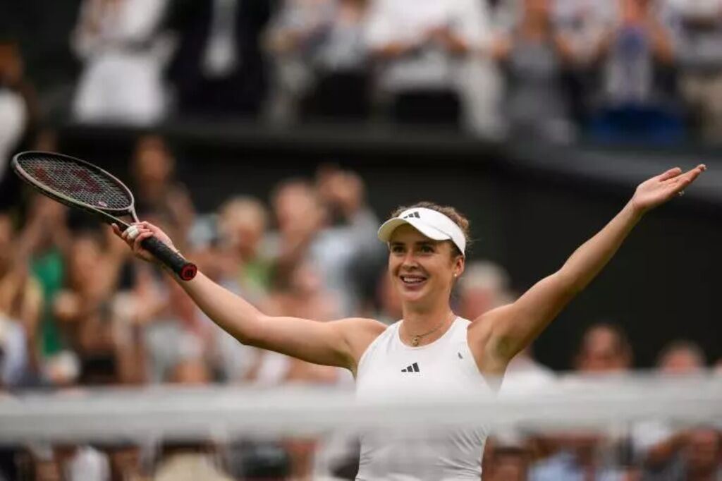 | L'Ukrainienne Elina Svitolina exulte après sa victoire sur la Polonaise Iga Swiatek, No1 mondiale, en quarts de finale de Wimbledon, le 11 juillet à Londres. |
