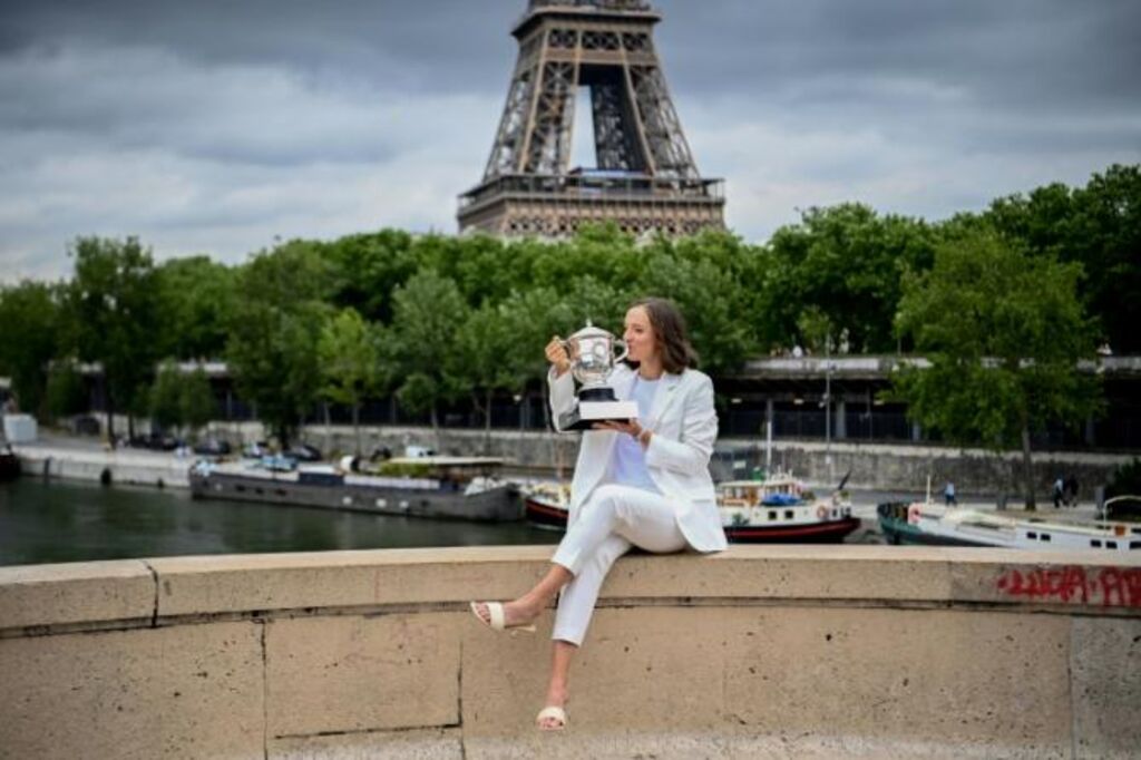 | La Polonaise Iga Swiatek pose devant la Tour Eiffel avec le trophée après sa victoire à Roland-Garros, le 5 juin à Paris. |
