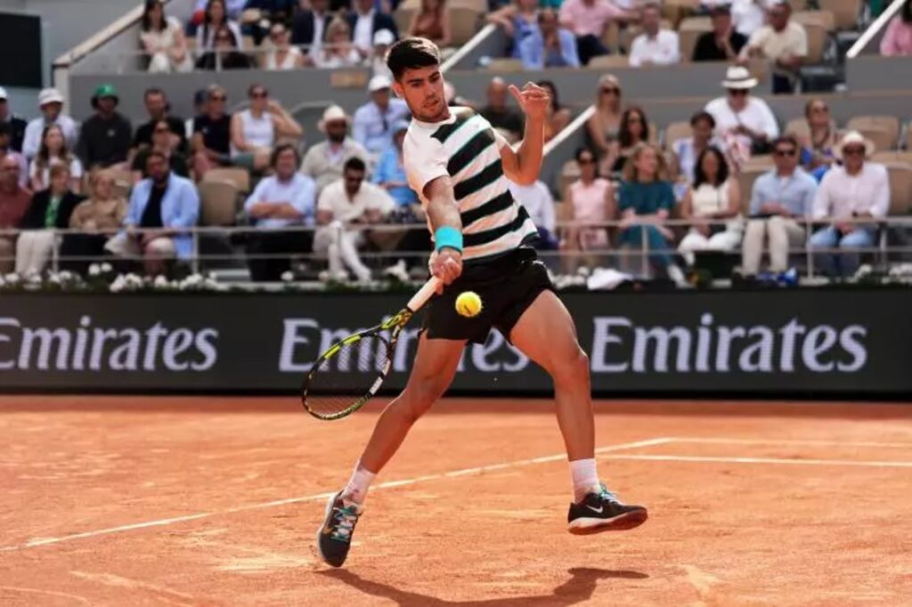 | L'Espagnol Carlos Alcaraz, tenant du titre, en huitièmes de finale de Roland-Garros contre l'Américain Ben Shelton le 1er juin à Paris. |