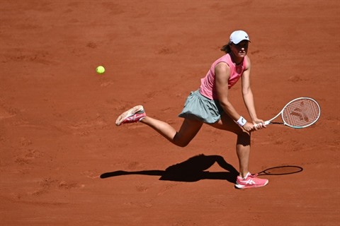 | La Polonaise Iga Swiatek, tenante du titre, au 1er tour de Roland-Garros contre la Slovène Kaja Juvan le 31 mai à Paris. |