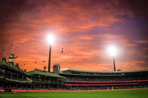 | Coucher de soleil le 29 novembre sur un stade de Sydney, en Australie, après une journée de canicule. |
