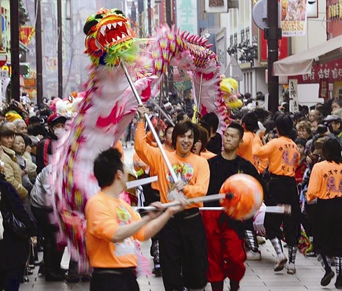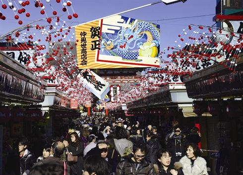 | Décorations dans la rue de Asakusa à Tokyo pour fêter l’année du Dragon. |