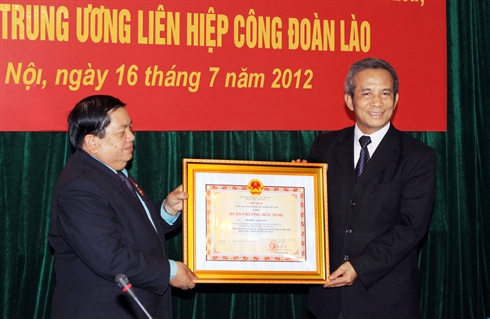 | Cérémonie de remise de l'Ordre de l'Amitié de l'État vietnamien au président de la Fédération des syndicats du Laos (FSL), Khamla Lolonsy, organisée le 16 juillet à Hanoi. Photo : Nguyên Dân/VNA/CVN |
