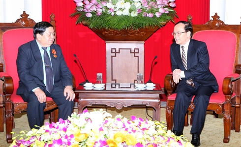 | Le président de la Commission du contrôle du Comité central du Parti communiste du Vietnam (PCV), Ngô Van Du (droite), reçoit le 16 juillet à Hanoi le président de la Fédération des syndicats du Laos, Khamla Lolonsy. |