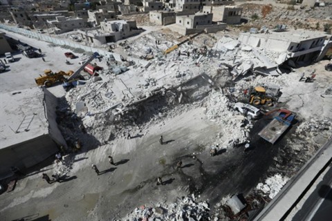 Des immeubles aplatis après l'explosion d'un dépôt d'armes dans une zone résidentielle de Sarmada, dans la province d'Idleb en Syrie qui a fait au moins 12 morts, le 12 août 2018. Photo: AFP/VNA/CVN |