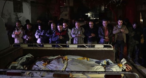 | Des Syriens prient devant les corps de victimes d'une frappe aérienne du gouvernement, le 3 avril à Damas. |