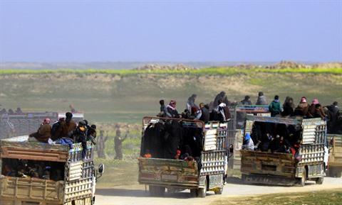 | Photo prise le 22 février 2019 près de la ville de Baghouz, dans l'Est de la Syrie, montrant un convoi de camions transportant des gens ayant fui le dernier réduit du groupe État islamique (EI). |