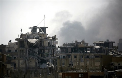 | De la fumée au-dessus de la ville de Raqa lors de combats contre l'EI, le 15 août en Syrie. |