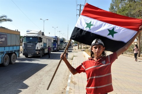 | Un garçon brandit le drapeau syrien tandis que passe derrière lui un convoi humanitaire en direction de Deir Ezzor. |