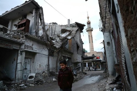 | Un enfant marche dans une rue bordée de maisons détruites, le 9 janvier à Douma, près de Damas, en Syrie. |